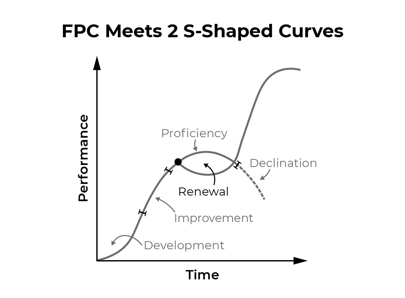 The first thing to highlight is where the first four phases of our traditional performance curve show up, including Development, Improvement, Proficiency, and Declination. Then we can highlight the Renewal phase. The Renewal phase shows up in the space where the two curves overlap. Visually, figure 8.4 outlines what we have when we put all the parts together: